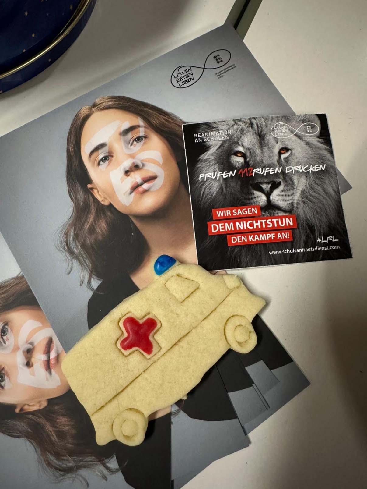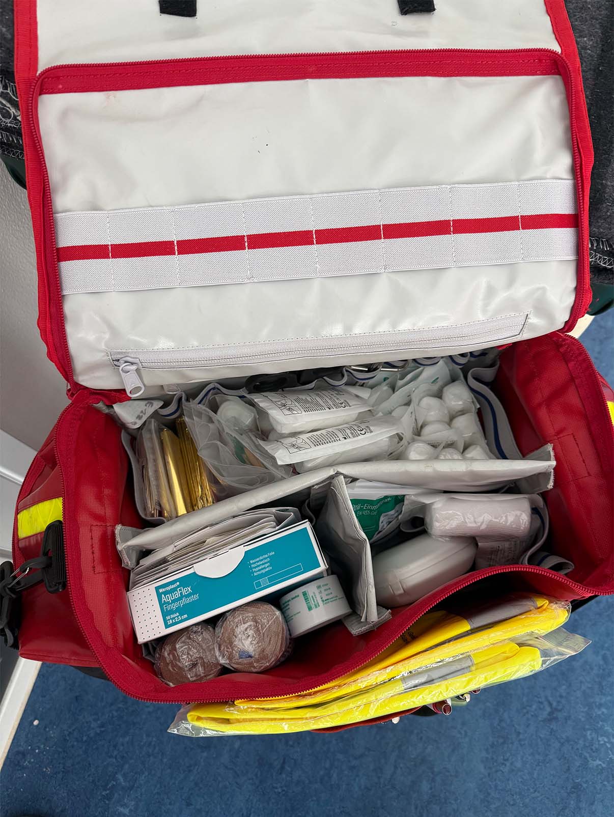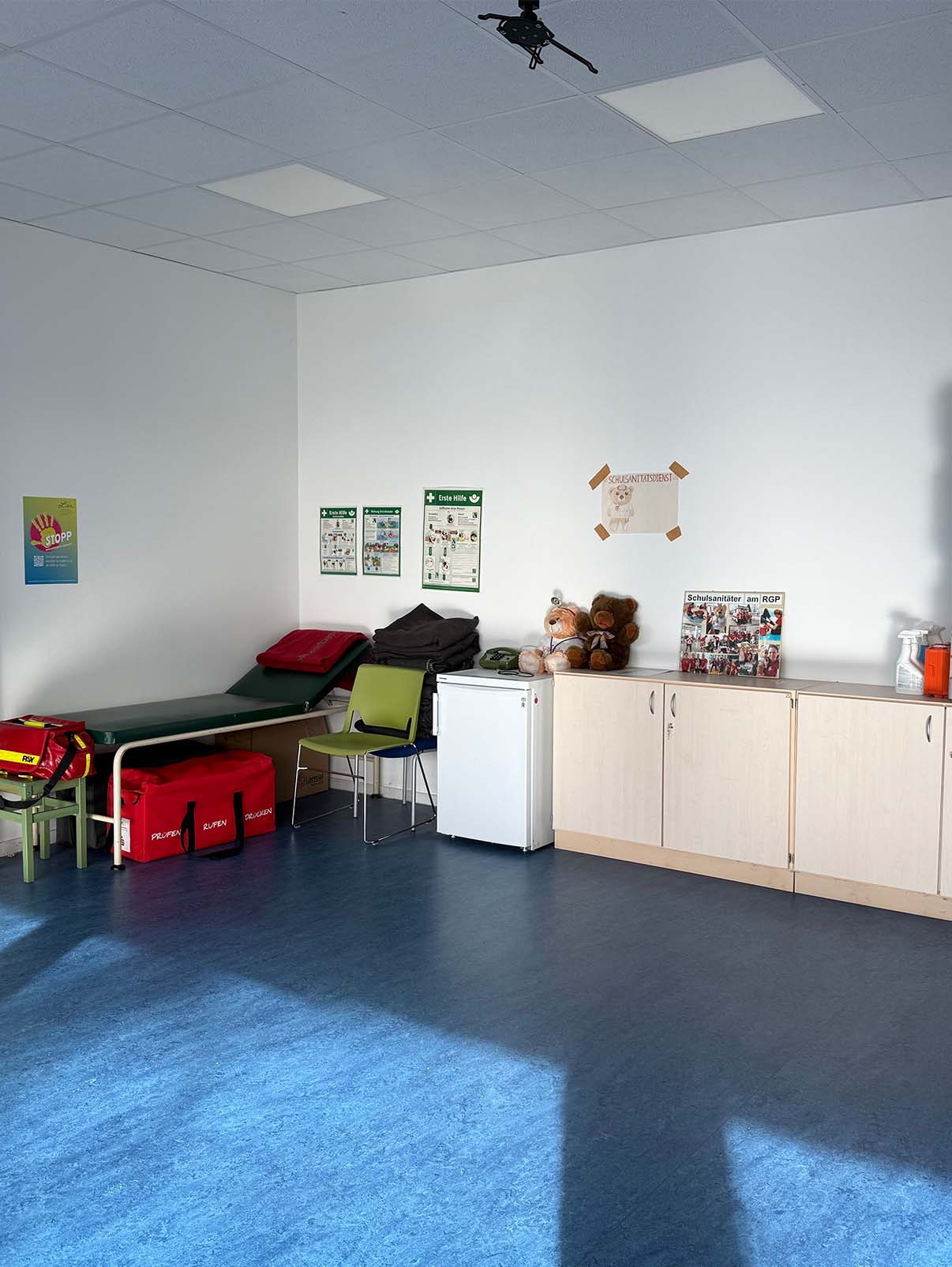 Unser Saniraum verfügt über eine Liege, Schränke mit sterilem Material und Material, das über Erste-Hilfe-Maßnahmen hinausgeht, wie beispielsweise SAM-Splints und ein Blutdruckmessgerät. Teil unserer Ausstattung ist auch ein abschließbarer Kühlschrank in dem wir Notfallmedikamente für chronisch erkrankte Schülerinnen und Schüler aufbewahren könnten. Nach jedem Einsatz füllt der Schulsanitätsdienst ein Einsatzprotokoll aus und füllt eigenständig die verbrauchten Materialien wieder auf.