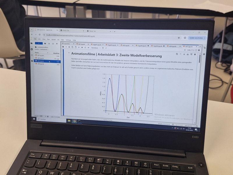 Im zweiten Workshop wurden die Grundlagen für möglichst realitätsnahe Bewegungsabläufe in Animationsfilmen bearbeitet. Dazu wurden Keyframes festgelegt und die Bewegungen dazwischen als Funktionen mit Hilfe verschiedener Interpolationsmethoden angenähert.