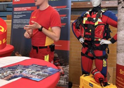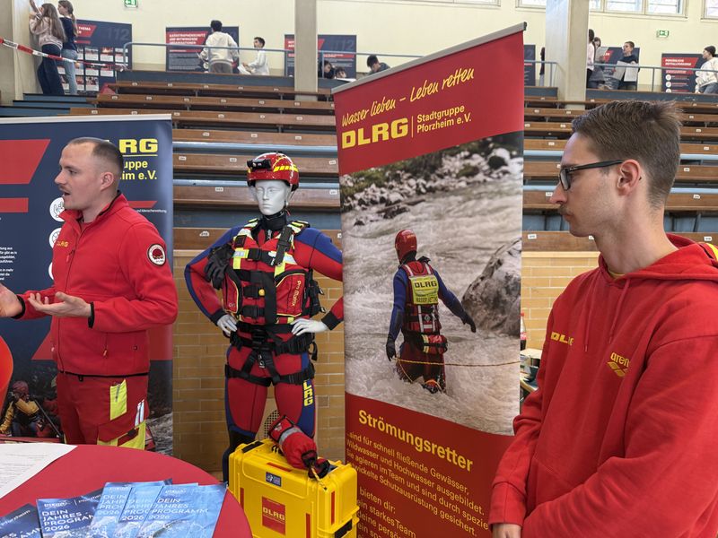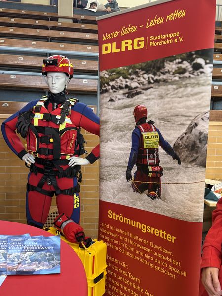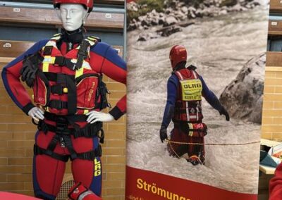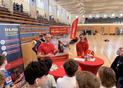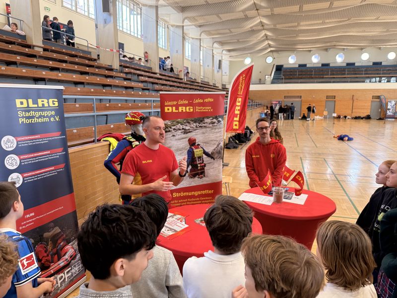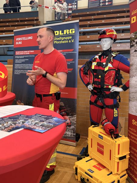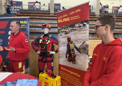 Die DLRG bot eine realitätsnahe Wasserrettungs-Simulation an: Mit einem Schlauchboot musste ein Dummy vom Hallenboden geborgen werden. Dabei wurde deutlich, wie anspruchsvoll und verantwortungsvoll Einsätze im Wasser sind, insbesondere bei Naturkatastrophen.