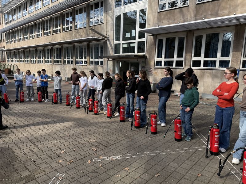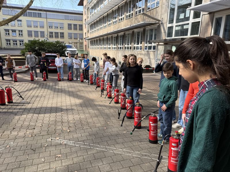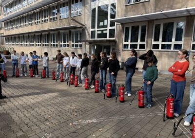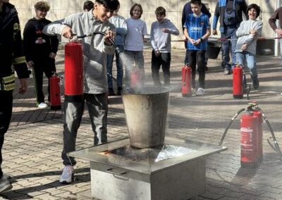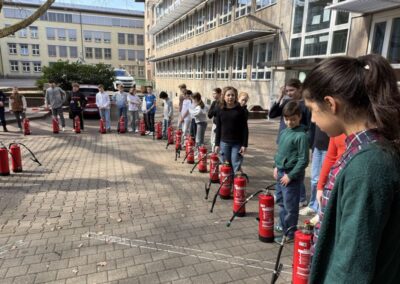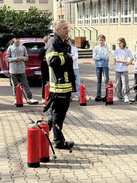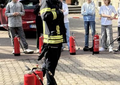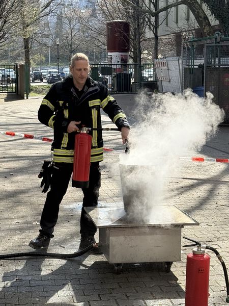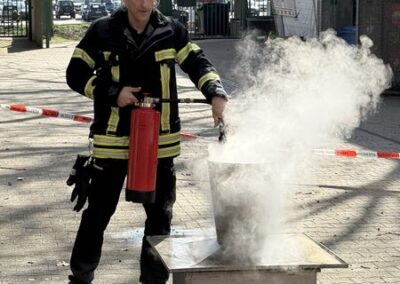 Die Feuerwehr vermittelte anschaulich die Grundlagen der Brandentstehung und zeigte eindrucksvoll, wie Brände effektiv bekämpft werden. Ein besonderes Highlight war die praktische Übung mit dem Feuerlöscher: Die Schülerinnen und Schüler, ebenso wie die begleitenden Lehrerinnen, durften ihr neu erworbenes Wissen direkt anwenden und eine brennende Feuerschale löschen.