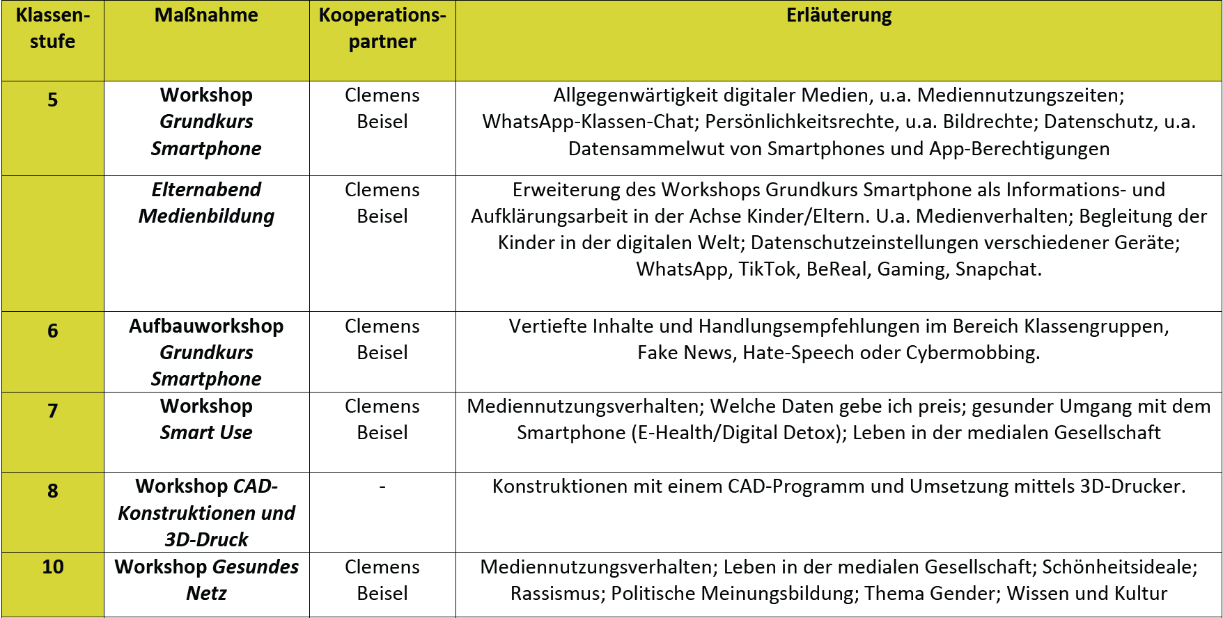 Der bislang schon sehr erfolgreiche Basiskurs Medienbildung wird durch eine Bildungsplanänderung des G9neu zu einem eigenständigen Unterrichtsfach aufgewertet. Von Klasse 5 bis zur Kursstufe sinkt der Anteil an Medienbildung zu Gunsten von Informatik beständig. Wir kooperieren mit Clemens Beisel, der als Medienpädagoge jahrelange Erfahrung im Bereich der Medienbildung vorweisen kann.